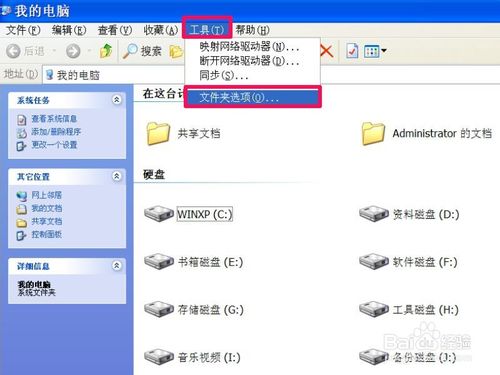 2,进入我的电脑资源窗口后,点击菜单栏上的“工具”这一项,在打开的菜单中选择“文件夹选项”就能打开了。