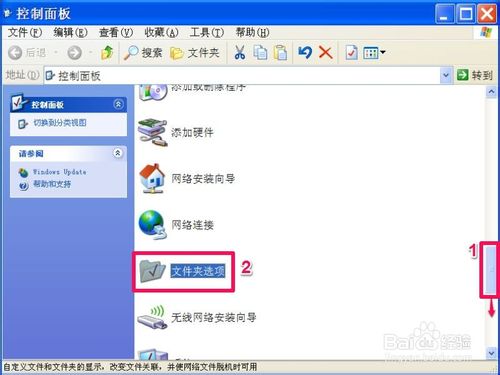 4,然后在控制面板窗口中,拖动右侧滚动条,找到“文件夹选项”这个图标,双击,也能进入“文件夹选项”内。