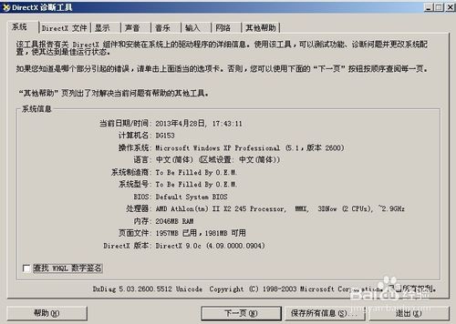 4、dxdiag是系统诊断工具,它可以测试声音,显示的3D效果,得到系统运行3D的效果。在右边则是系统驱动的相关信息。在系统中可以查看相关的系统配置,如BIOS,处理器,页面文件。