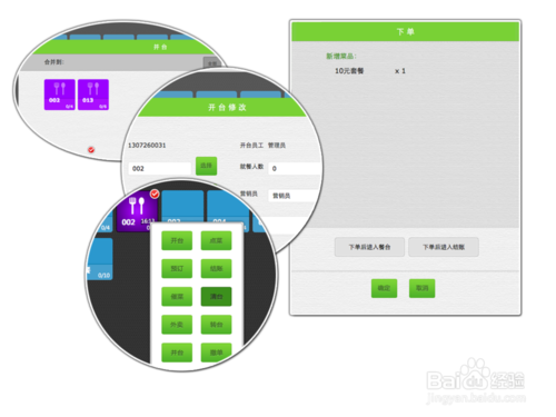 7、开台下单 支持开台、转台、并台、清台操作,服务员下单完毕后执行下单操作即可打印 后厨相关票据,订单的加菜、催菜、退菜等操作,也将即时通知后厨和服务台。