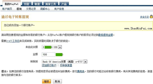 从PayPal提现到美国银行账户需要3到4个工作日来完成,实际所需时间取决于银行(我是11号傍晚申请的,13号晚上就收到邮件说P卡已充入资金)。如果银行信息有误,则提现款项会被退回PayPal并加收手续费,银行那边可能还会收手续费。PS:已经发现好几个流氓,直接盗用我的Payoneer教程,不注明出处也就算了,还抹掉图片里的网址和zhaoniupai的个人信息。