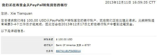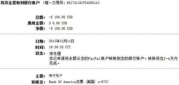 从PayPal提现到美国银行账户的交易明细,无手续费