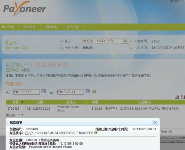 首次从PayPal提现100刀到美国银行账户,再自动转入Payoneer万事达预付卡后就只剩69.05刀了