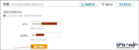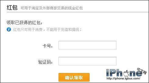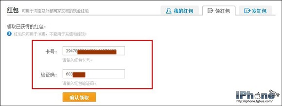 4、进入领红包页面后,输入已获得的红包卡号和验证码。