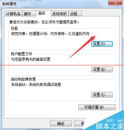 5、点击系统高级设置,会弹出一个系统属性框,我们在上方菜单找打高级,然后在高级列表里找到性能选项,点击性能后方的设置按钮,