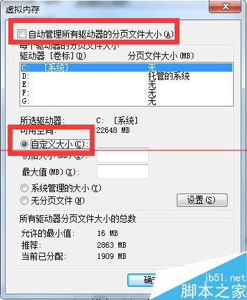 7、进入虚拟内存设置选项,我们在自动管理所有驱动器分页大小前面勾去掉,然后点击下方的自定义大小。