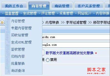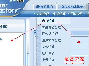 二级菜单:信息管理、生成管理、评论管理、采集管理等;