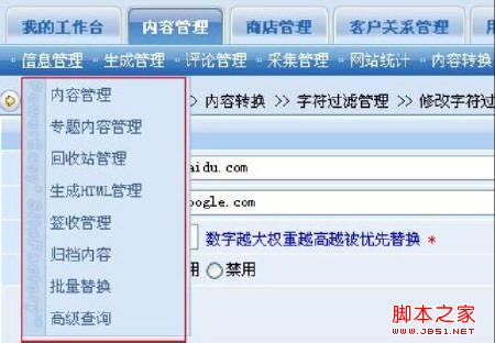 三级菜单:内容管理、专题内容管理、回收站管理等。