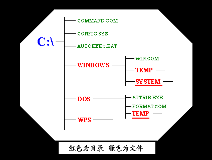 那么目录是什么结构的呢?目录是树形结构的,你看,下面是一个目录结构的示意图,这个C:表示最上面的一层目录,叫做根目录,其它的目录都是根目录的子目录,如DOS,WINDOWS,TOOLS等,而DOS,WINDOWS目录自己也有子目录,象DOS下的TEMP目录,WINDOWS下的SYSTEM目录。