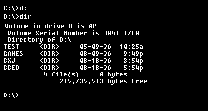 如果我们要更换当前目录到硬盘的其它分区该怎么办呢?当然不是使用CD,否则我就不用说了,这时应该输入盘符然后回车。比如要到D盘,那么就输入D:,然后回车,瞧,现在提示符就变成D:\>了。 再用dir命令,就是列出D盘的文件了。