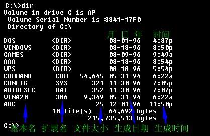 我们再来看看倒数一二行,这些是什么意思呢。“ 10 file(s) ”是要告诉你这个目录内有 “ 10 ”个文件,这些文件加起来一共有“ 64,692 bytes”大,在这种计算中,每个子目录也算是一个文件,但它的大小算零。最后一行的是告诉你当前你的工作磁盘上还剩下“ 215,735,513 bytes”大小可用的磁盘空间。