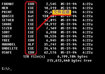 其中凡后缀为exe、com或bat的文件都是可以直接执行的。这些以exe为后缀的文件叫可执行文件;以com为后缀的文件叫命令文件;以bat为后缀的文件叫批处理文件。如果我们要执行这些文件,只需在提示符下敲入文件基本名然后回车即可,不需输入文件后缀。