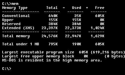 又比如,第二行的这个文件mem.exe,其后缀是exe,也是一个可以执行的文件,它的功能是查看电脑目前内存的占用情况。在提示符下敲mem,然后回车。(这个命令没问题,你可以试试看)