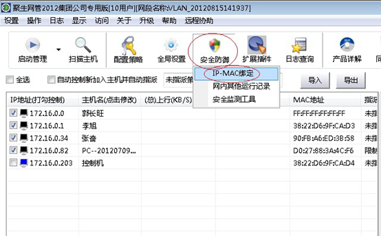 目前国内有很多局域网控制软件、网管监控软件,一般都有IP和MAC地址绑定的功能。通常,通过此类网管软件可以轻松扫描到局域网电脑IP地址和MAC地址,然后点点鼠标就可以实现绑定。例如,有一款“聚生网管”软件(下载地址:http://www.grabsun.com/soft.html),只需要在局域网一台电脑安装,就可以扫描到局域网所有电脑的IP地址和MAC地址,然后点点鼠标就可以绑定了,绑定之后局域网电脑将无法修改IP地址和MAC地址,一旦修改之后就无法上网,从而阻止了电脑修改IP地址的行为,如下图所示: