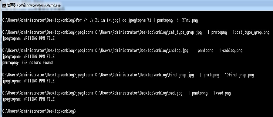 8. 批量转化图片:for /r .\ %i in (*.jpg) do jpegtopnm %i | pnmtopng > %~ni.png