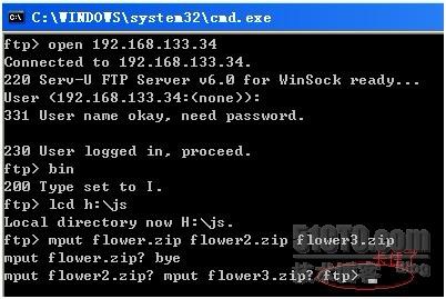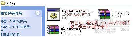 实例二:用put,get上传,下载单个文件 把XP机器上H:\js目录下文件flower.zip上传到FTP服务器