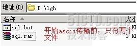 二、实例求证: 环境说明:192.168.133.34上有一FTP服务器端(windows版),FTP用户名为lgh,密码为www.jb51.net。该用户的根目录为D:\lgh。里面文件见下图。sql.rar是sql.bat的压缩文件,大家注意看图,我等下会在后面的实例中引用这个文件,把mget,get,prompt,bin,ascii等ftp命令诠释得一清二白。