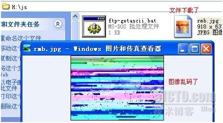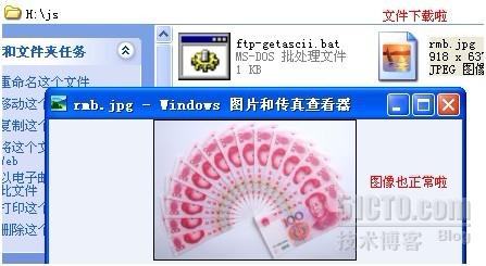 执行ftp-get-ascii.bat后,发现rmb.jpg可以正常上传,并且可以正常打开,那,这个现象与前面所以的ascii不能传输非文本东西有出入,这是怎么回会事呢。