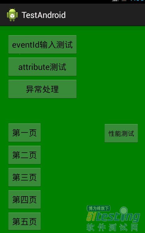 测试背景:由于需要对产品的SDK做接口测试,而这些接口需要在app里面调用,故开发了一个简单的android应用(如图),用来调用需要测试的接口,app中的每个按钮其实都是一个测试模块。