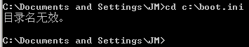cd的全称是Change Directory,直译为改变文件夹,也就是跳转目录、切换路径的意思。它后面可以接驱动器符号、完整路径和相对路径。从它的全称可以得知,它不能操控文件,而只能作用于驱动器或文件夹。例如,我们使用 cd c:\boot.ini 这个命令来跳转(boot.ini是文件而非文件夹),就会出现“目录名无效”的错误,如下图所示。