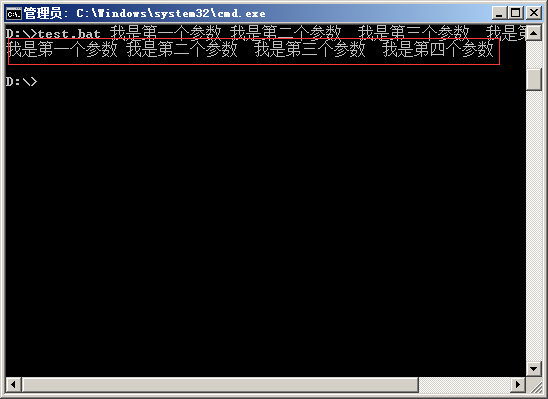 然后输入 test.bat 我是第一个参数 我是第二个参数 我是第三个参数 我是第四个参数