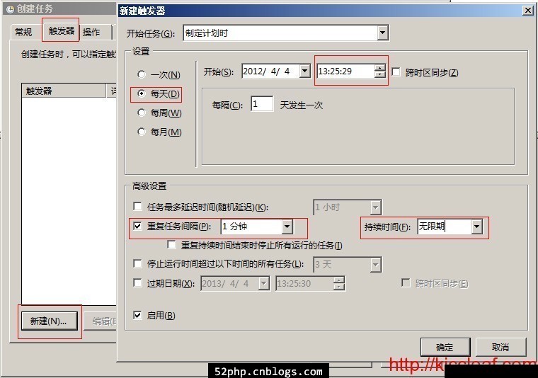 3、选择“触发器”选项,点击“新建”,创建任务执行时间,“重复任务间隔”这个选择后,后面有时间选择,是每小时,还是每分,可自己选择后再修改时间,再确定。