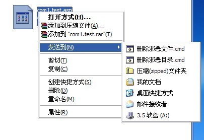 3、找到邪恶的文件,比如com1.test.asp,右击,选择发送到,删除邪恶文件就可以了。如果是目录,选择删除邪恶目录。