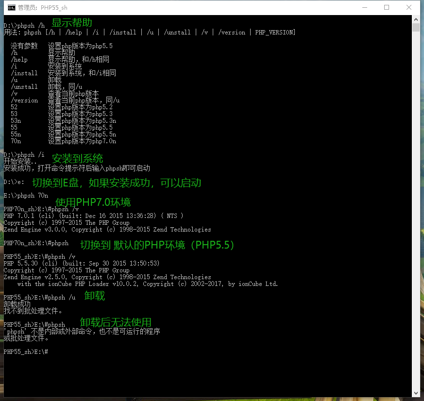 最近用php代替vbs脚本,做些小工具的开发。为了方便测试不同php版本的兼容,专门写了一个 php版本切换的 批处理 phpsh.cmd,支持安装到系统、卸载等功能,还支持多个php版本的任意切换(需要先安装phpStudy)。