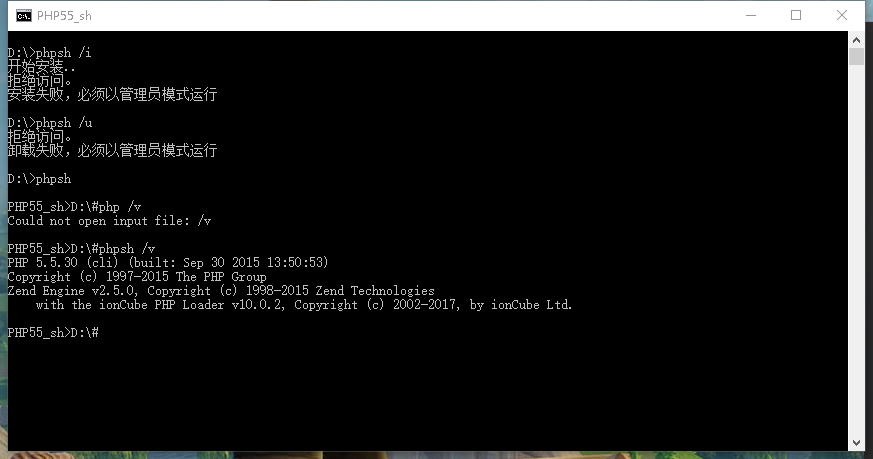安装成功后,就不用使用管理员身份执行了。可以在任意目录 执行 phpsh,会自动设置php环境。