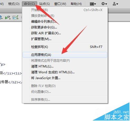 3、下面就是关键的步骤了,我们点击菜单栏中的“命令”,在其菜单中找到“应用源格式”选项并点击。