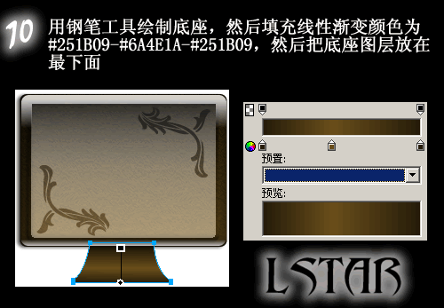10.用钢笔工具绘制底座,然后填充线性渐变颜色为#251B09-#6A4E1A-#251B09,然后把底座图层放在最下面。