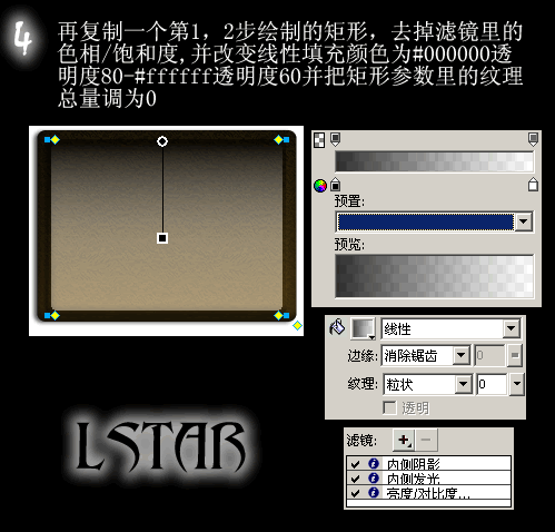 1.画一个233*172 的圆角矩形并填充#400000 -#999999 的线性渐变,然后设定其参数如图: