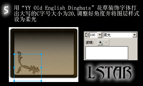 5.用“YY Old English Dingbats”花草装饰字体打出大写的C,字号大小为20,调整好角度并将图层式样设为柔光。