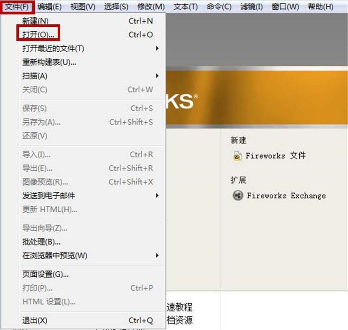 1、打开Fireworks软件界面,鼠标单击功能区中的“文件”选项卡,在弹出的列表中点击“打开”命令