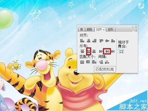3、对齐面板中,点击“匹配宽和高”、“水平居中分布”、“垂直居中分布”,使图片与舞台同大小、同位置。