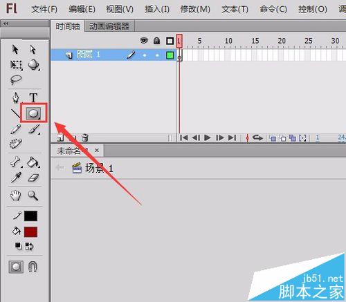 3、点击椭圆工具,用鼠标左键在舞台上绘制一个椭圆形,如图所示:
