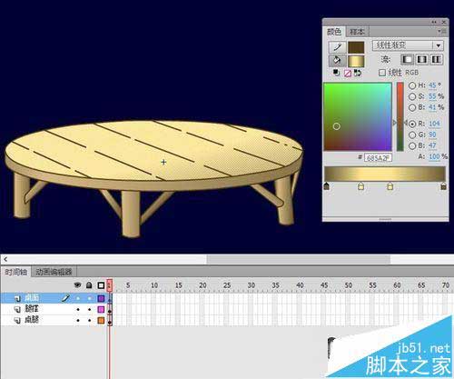 7、新建一个图形元件,取名桌子。分别用椭圆、线条、圆角矩形绘出桌面、桌腿与腿撑。渐变填充如图。