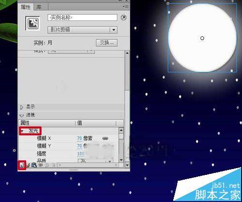 ②场景中新建一层,取名月。将月拖入右上角,属性面板滚动条拖至下方,为月亮添加发光滤镜,参数设置如图(是个人文档大小设置)。