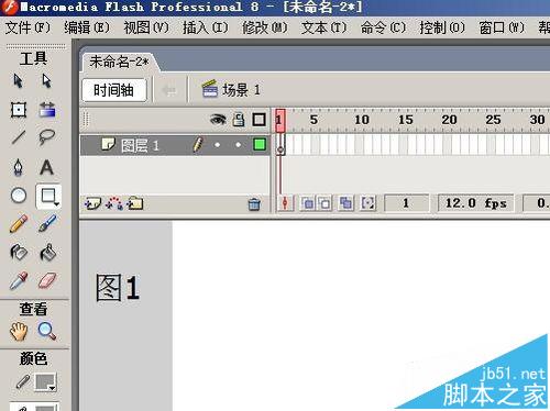 1、以图中新建flash8文件为例演示操作步骤 ;在界面的左侧工具箱中点“矩形”工具图标;再点“填充色”图标;