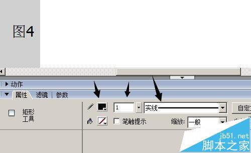 2、弹出颜色选项框,在框右上方,点如图3箭头所指的图标,表示无填充色;再在属性面板中,把“笔触颜色”设置为黑色;把“笔触高度”设置为1;把“笔触样式”设置为“实线”;如图4所示;