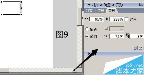 4、在工具箱中点选“任意”变形工具;矩形即变成如图7所示的样式;图形中四周有8个控制点,中间位置有一个变形中心点;现在,再点选“选择”工具,光标放在变形中心点侧边,当光标箭头右侧显出一个小圆圈时,即表示可以移动变形中心点了。然后,把变形中心点移到矩形的左下角;
