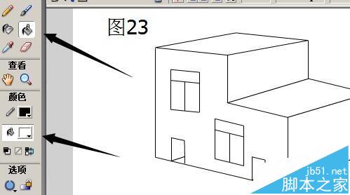 15、把窗上加一点光泽;在工具箱中点选“线条”工具,线条颜色设置为灰色;笔触样式为“级细”;在窗上画斜线,如图29所示;两层楼房即绘制完成。