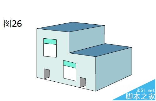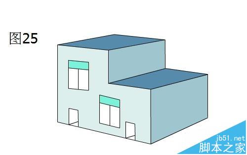 13、再把右侧墙面颜色填充为“#9FC6CE”颜色;把当前墙面颜色填充为“#DCEFED”颜色;把窗填充颜色为“#79F4DB"颜色;如图25所示的效果;然后,再给门做些阴影;填充颜色为”#999999“颜色;