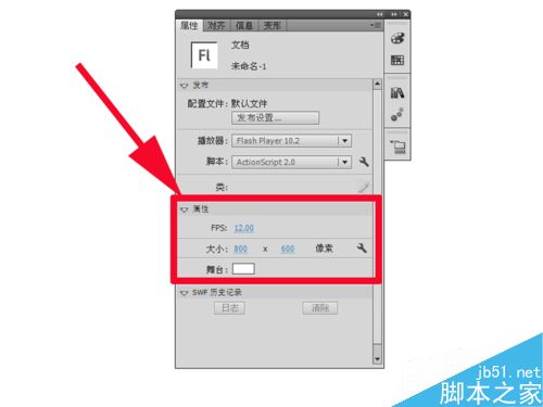 1、启动flash cs5,执行ctrl+n组合键,新建一个大小为800*600,帧频为12fps,背景颜色为白色的文档。