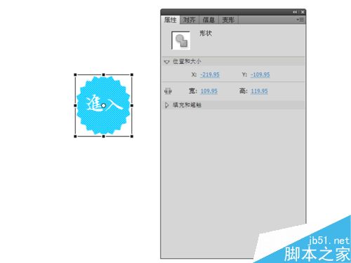 5、选择工具箱里文本工具,设置属性面板,字体设置为“王羲之书法字体”,字体大小设置为30,颜色设置为白色,在多边形上输入文字为“进入”。