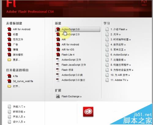 1、首先,双击点开flash cs6图标,稍等片刻,打开软件,选择Actionscript3.0,新建一个文档,可以先保存一下文档。