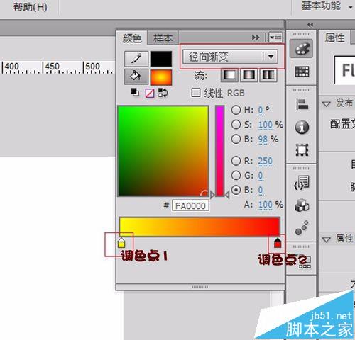 8、选择颜色对话框-->类型选择:径向渐变,选择左边调色点,R:255 G:255 B:0。选择右边调色点,R:250, G:0 B:0