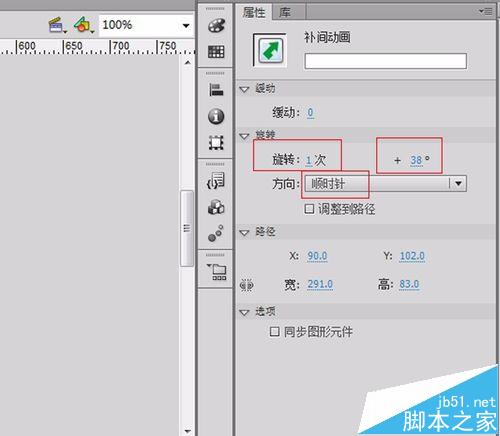 14、点1-15之间的任意帧,点击属性面板,设置旋转,旋转次数选1次,方向顺时针,+38°。参数如图。