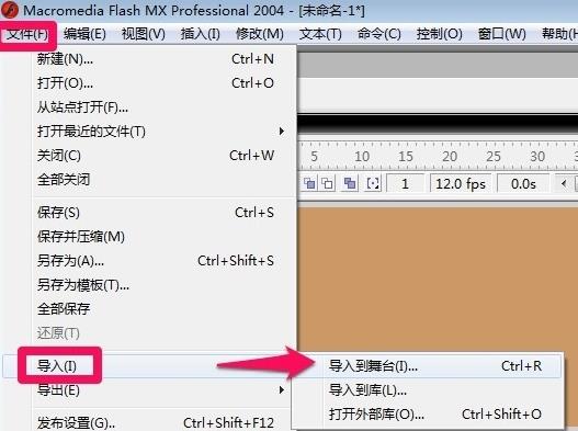 3、当然这里我们可以自己在窗口中绘制图形,比如绘制一个齿轮,但是这里为了给大家介绍旋转动画的制作方法,这里小编就不绘制了,这里我们直接用网上下载好齿轮的图片使用。点击文件菜单,导入,导入到舞台,当然你也可以导入到库中,这里小编就直接导入到舞台上吧。