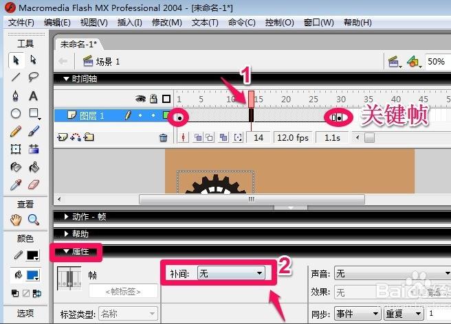 7、鼠标点击两个关键帧的中间,然后打开属性面板,点击这里的补间!